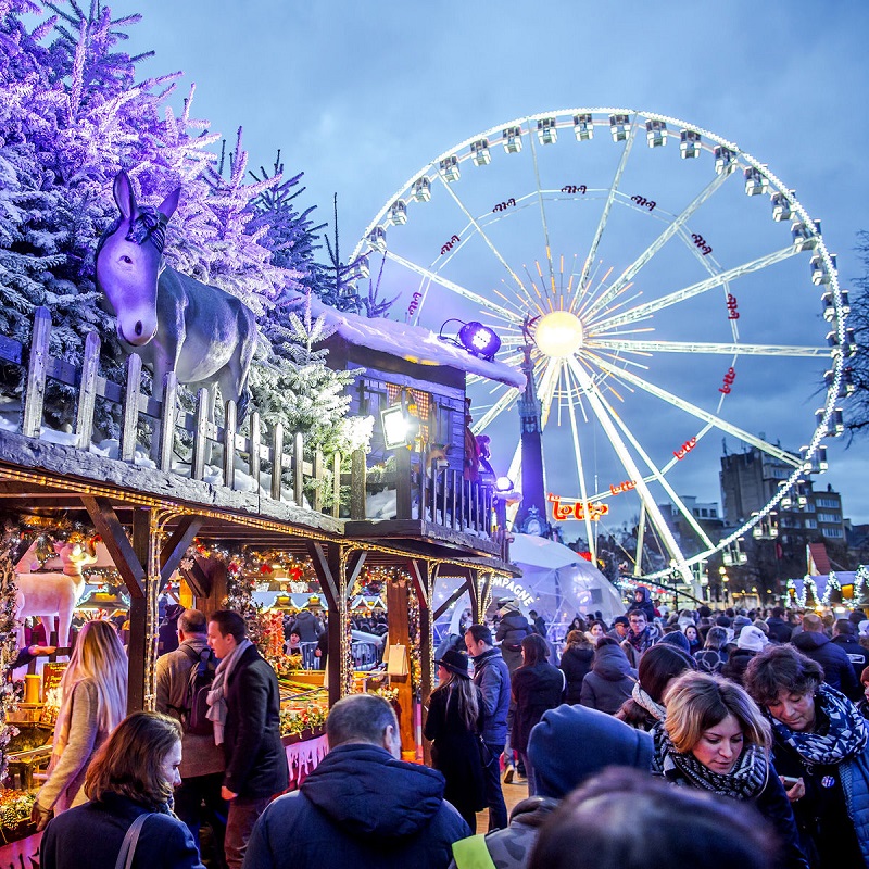 ベルギーで、最大規模のクリスマスマーケット。証券取引所および聖カトリーヌ教会周辺に合わせて270もの屋台小屋が出現します。55メートルの大観覧車や1,000㎡のスケートリンクも登場。